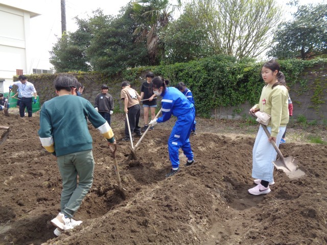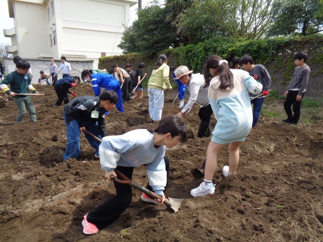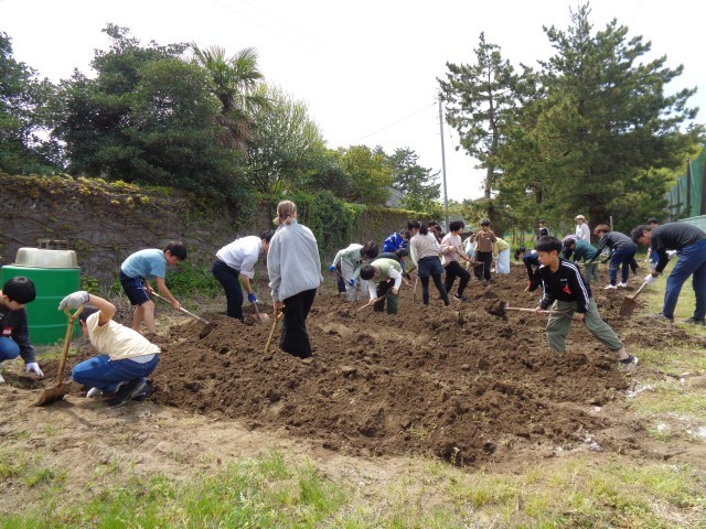 午後からは、畑の畝作りをしました。5・6年生が協力し、幅の広い畝が完成しました。