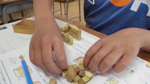 算数では、体積の表し方を学習しました。1㎤のキューブを並べて様々な直方体や立方体をつくりました。