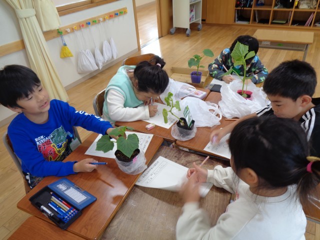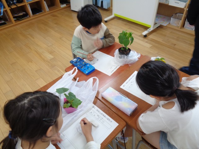 苗の観察では、「はっぱを触るとちくちくするよ」「つるが伸びてくるくるしてるよ」とよく見て気付いたことをたくさんカードに書いていきました。