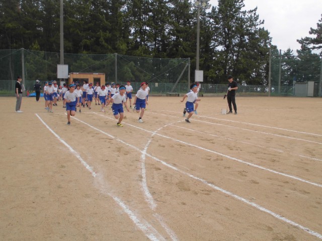 今日の体力つくりは、運動会本番と同様にスターターピストルを使って、50m走を行いました。