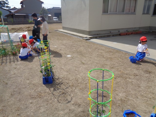 植木鉢を置く場所を選ぶ際には、「お花と仲良くなってほしいから花壇のとなりにしよう」「一番あたたかいところにしよう」と、あさがおのことを考え、場所を決めた子供たちでした。