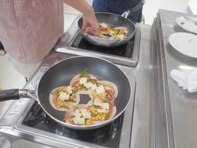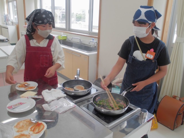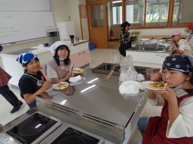 家庭科クラブでは餃子の皮を使ったミニピザづくりに挑戦しました。鮮やかな手つきで具材を切り、優しく見守る6年生と、炒めたりケチャップを塗ったりとチャレンジいっぱいの4年生が仲良く調理していました。おいしく作ることができました。