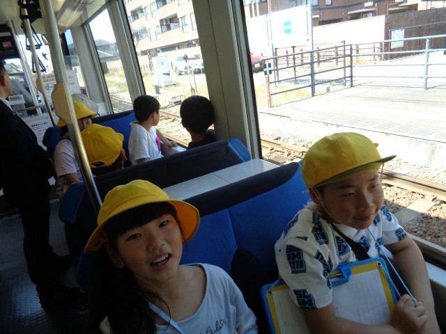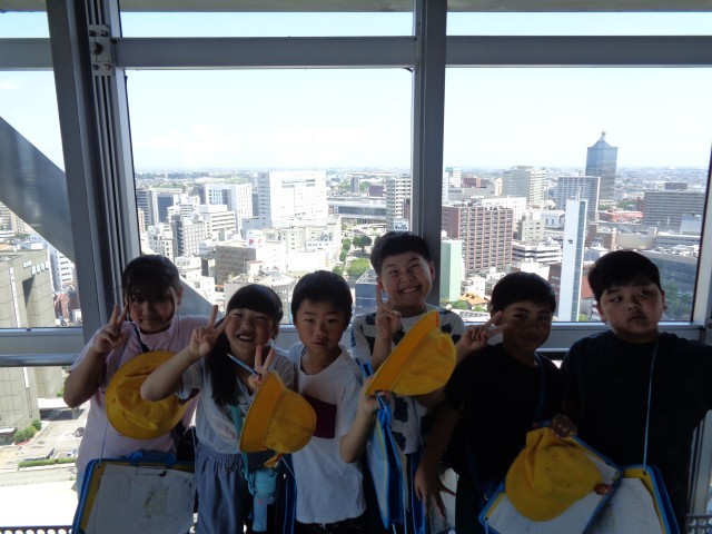 富山市役所展望台と、岩瀬浜の富山港展望台に行きました。子供たちは街を見回し、知っているものがないか探したり、遠くのものにも目を凝らして見つめたりしていました。学校に帰ってきてからも、見つけたことをホワイトボードいっぱいに書いて話し合いをしました。