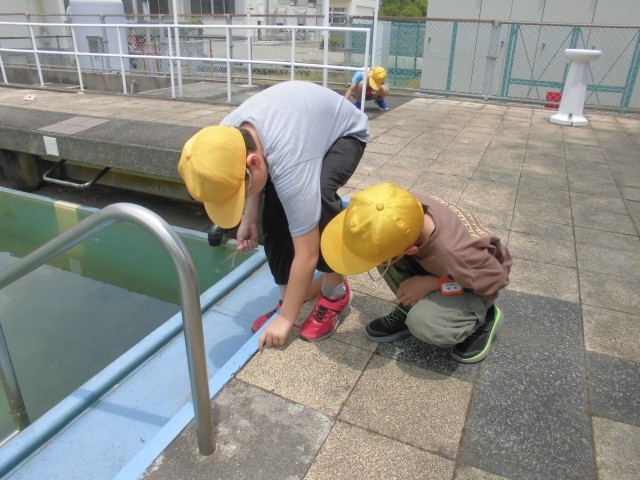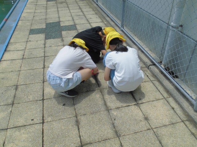 はまっ子みんなが安全にプールサイドを歩けるようにと、時間いっぱい草を抜いたり松葉を取り除いたりしました。