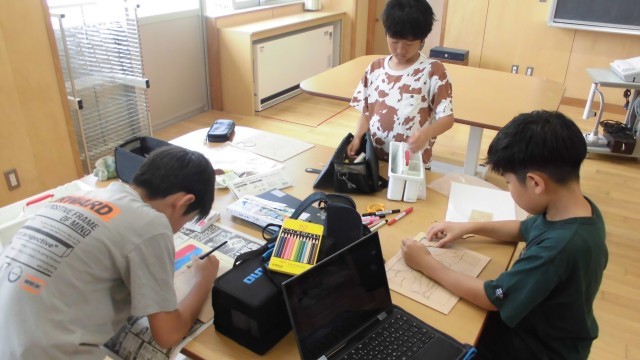 図画工作科では、前回に引き続き、糸ノコを使って作品を切り出しました。ピースの形にも、個性が生まれています。