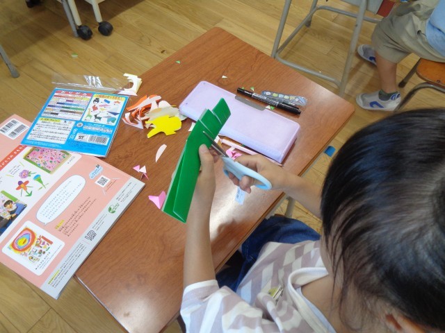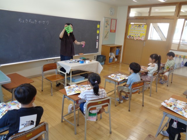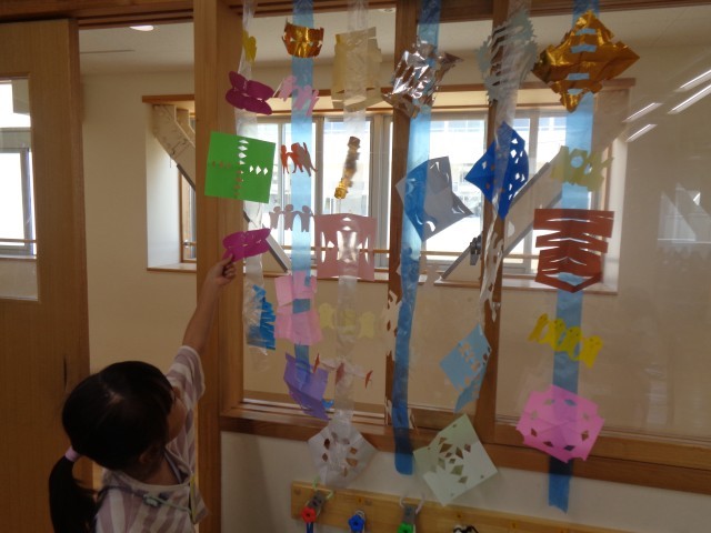 折り紙の折り方や切り方を工夫して、色々なかざりを教室に飾りました。