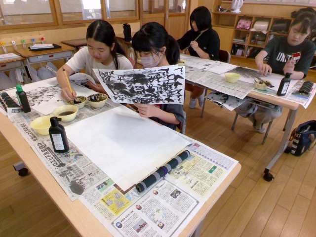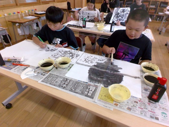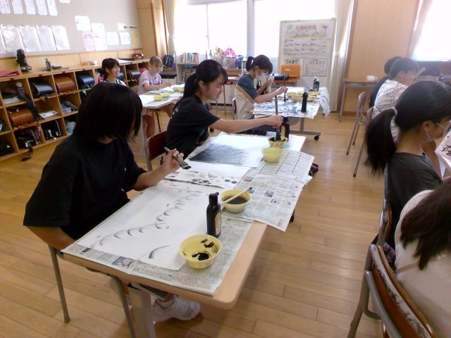 乾いた筆に墨をつけてかすれ具合を工夫したり、水の量を試したりして、自分なりの表現を楽しみました。