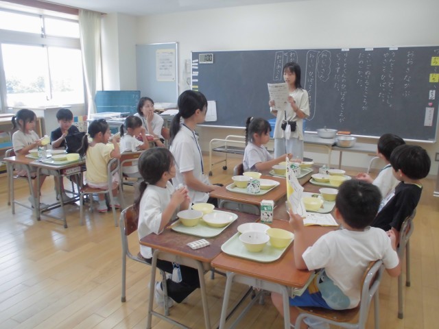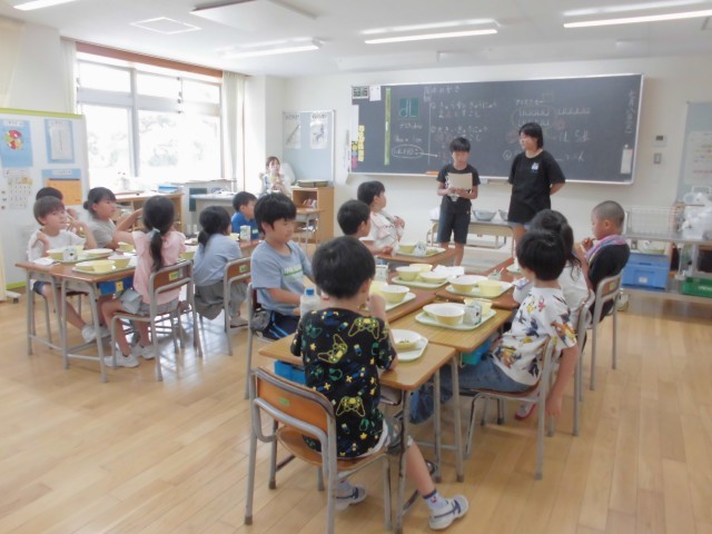 「給食を残さず食べよう」の目当てを達成しようと、気持ちを高めるはまっ子でした。
