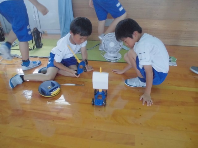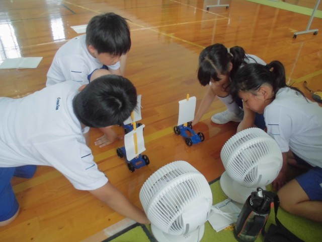 今日は、風の強さによって車の進みがどれだけ異なるのか実験しました。