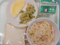 今日の給食の献立は、・食パン・オムレツ・こんにゃくサラダ・クリームスパゲッテ...
