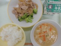 今日の給食の献立は、・ごはん・牛乳・豚肉のおろし炒め・ゆでブロッコリー・ワンタ...