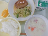 今日の給食の献立は、 ・ごはん ・和風ハンバーグ ・アスパラのごまだれ ・米粉シ...