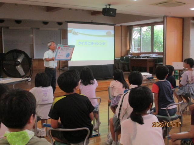 今日は、とやま環境財団の方々に来ていただき、地球温暖化の原因や防止方法などを、写真やクイズなどを交えて楽しく分かりやすく教えていただきました。教えていただいたことをもとに、大切な地球を守っていくために自分たちにできる10の取組にチャレンジします!