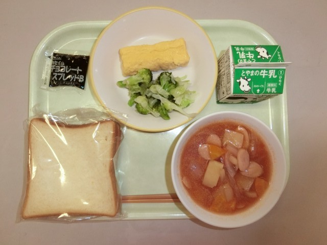 今日の献立は、食パン、牛乳、卵ロール、フレンチサラダ、ミネストローネ、チョコクリームです。
