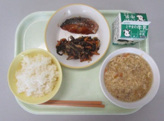 今日の献立は、ごはん、牛乳、ふくらぎの照り焼き、もずくのチャプチェ、中華かきたま汁です。