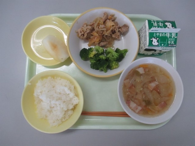 今日の献立は、ごはん、牛乳、豚キムチ丼、ゆでブロッコリー、白菜スープ、梨です。