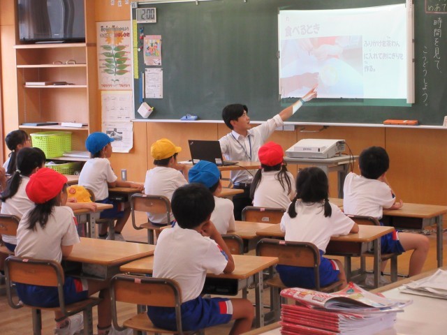 いつもとは違った給食の食べ方について、説明を聞いています。