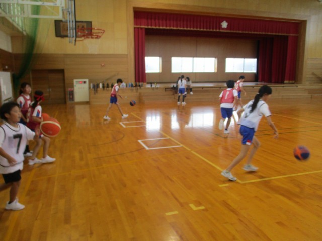 6年生では、バスケットボールの学習が始まりました。自分たちで準備をし、練習しています。