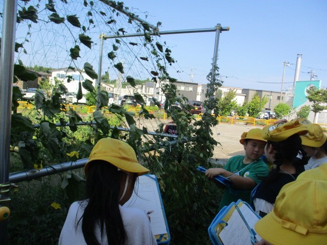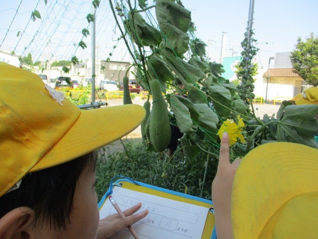 春から育てているヘチマの観察をしました。今年の猛暑になんとか耐えており、実を7つ付けていました。