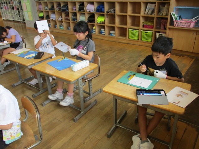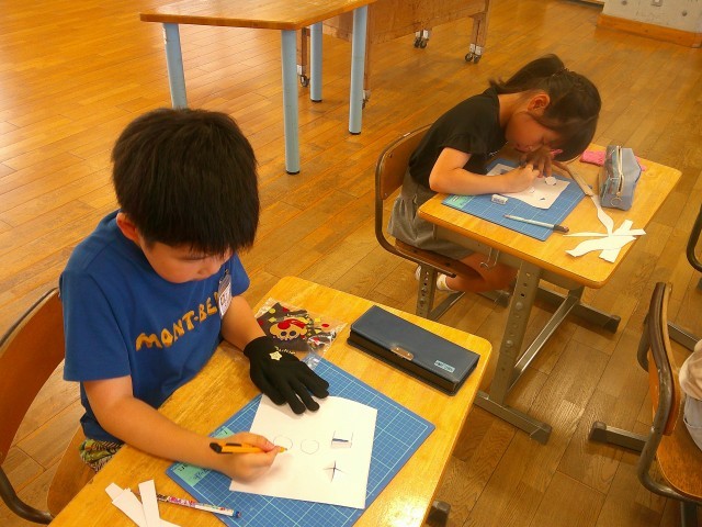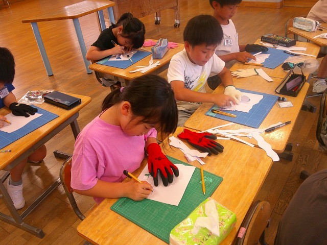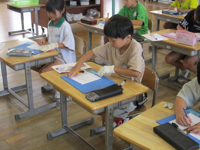 今週の図工「まどをあけたら」では、初めてカッターナイフを使いました。カッターの持ち方、手の動かし方を学習して、窓が開く形を切りました。「初めてだから、どきどきしたよ。」「思ったよりもきれいに切れて、まどを開けられたからうれしかったよ。」と楽しく活動しました。