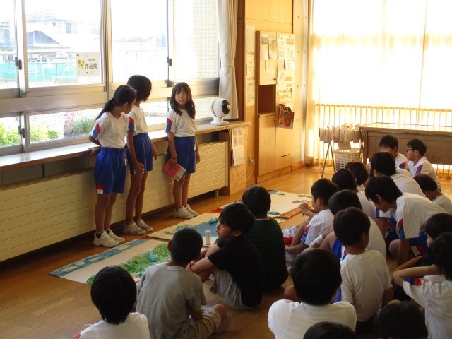 司会に立候補した子供たちが、クイズやじゃんけんゲームなどで朝から楽しく過ごせるように工夫をしています。学年みんなで活動する時間をこれからも大切にしていきます。