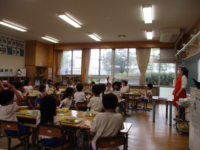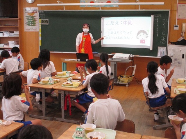 学校給食で毎日出される牛乳がどのように作られているのか、たくさんの人が牛乳ができるまでに関わっていることなどを、クイズを交えながら分かりやすく教えてくださいました。牛乳だけでなく他の食材も、関わってくださる方への感謝の気持ちを込めて食べキリンを続けていこうと思います。