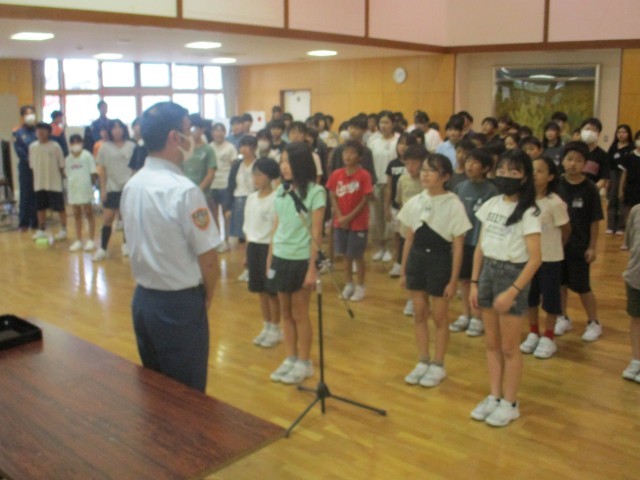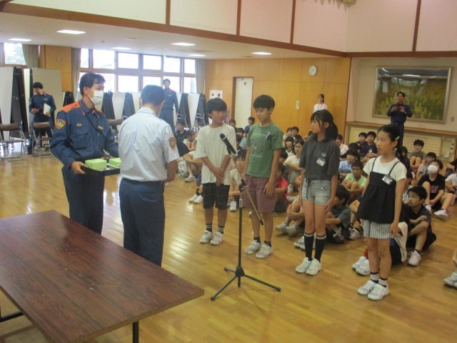 5、6年生全員でBFCバッジ授与式を行いました。子供たちは、消防署の方々のお話を真剣に聞いていました。授与式のあとは、煙中体験や防火のDVDを見ました。