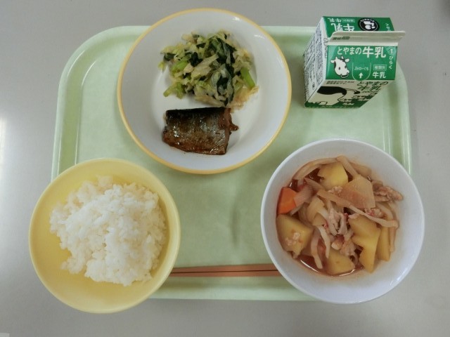 今日の献立は、ごはん、牛乳、にしんの照り煮、しょうがひたし、トマト肉じゃがです。