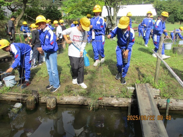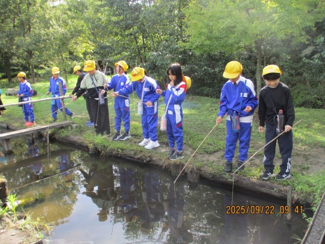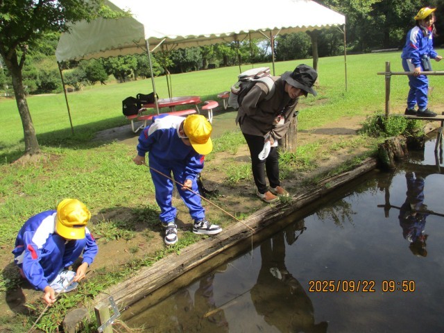 ザリガニ釣りをしました。餌はさきいか。さきいかの匂いをがぎつけたザリガニが、さきいかをはさみで挟んだところをそーっと釣り上げました。子供たちは釣れると嬉しそうに声を上げていました。