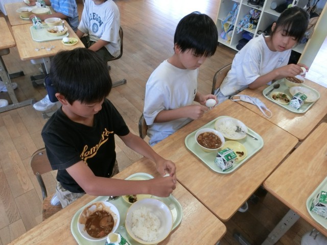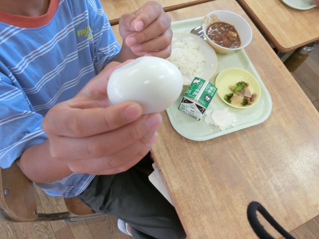 ゆで卵を真剣に剝いていました。「きれいにむけたよ」と見せてくれました。