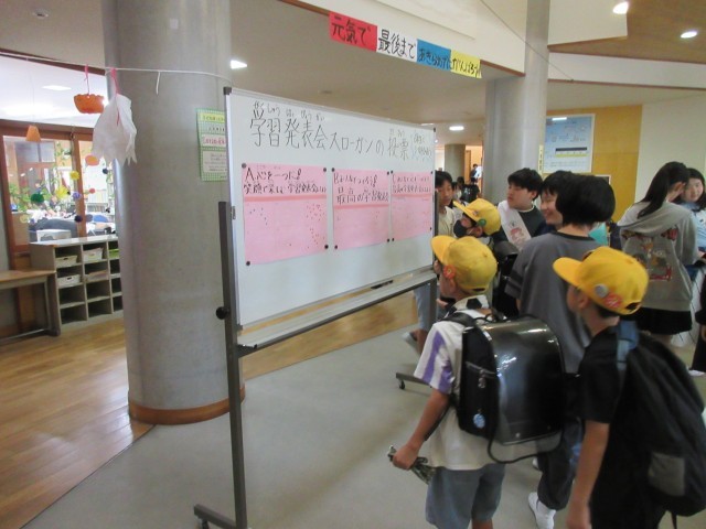 代表委員の子供たちが学習発表会のスローガンの案を3つ考えました。