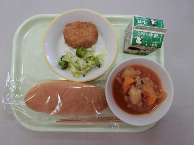 今日の献立は、コッペパン、牛乳、かぼちゃコロッケ、そえ野菜、、豆と鶏肉のトマト煮です。