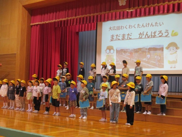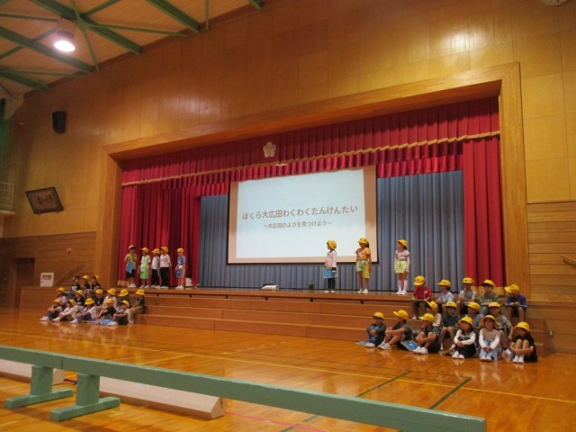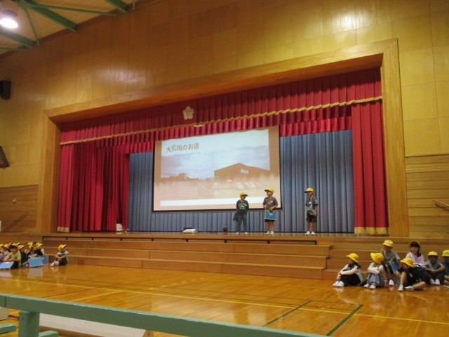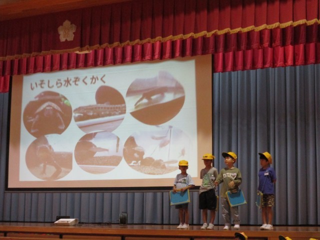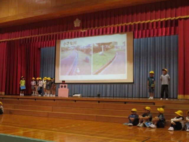 これまでにたくさん探検に行ってきたり、調べてきたりしたことを全校児童の前で発表しました。