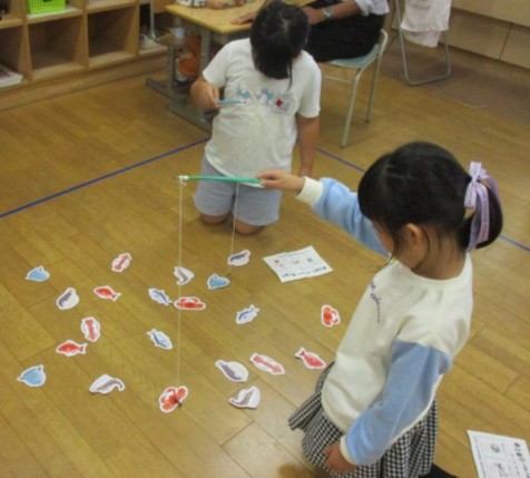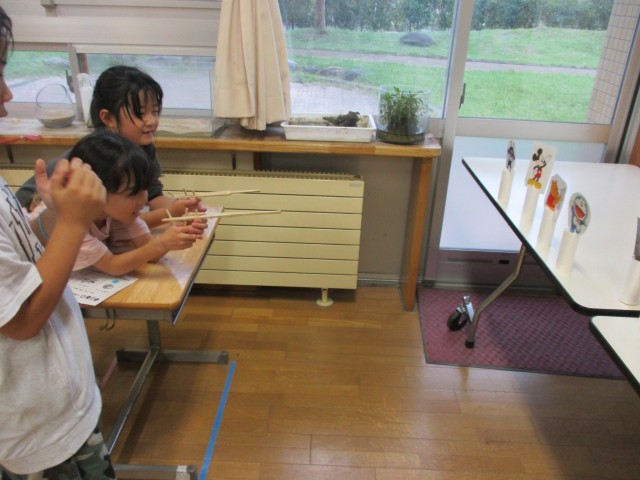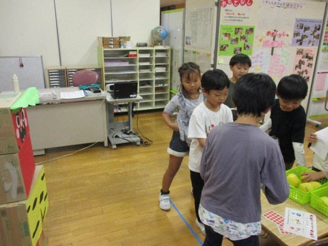 生活科の時間に、「おまつり」に呼んでいただきました。的あて、射的、魚つりの3つのゲームがあり、一つずつ遊ぶことができました。全部クリアできたら、キバナコスモスの種をいただきました。コスモスの種を見たのが初めてで、「こんな形してるなんてびっくりした」と喜んでいました。すてきなおみやげができました。