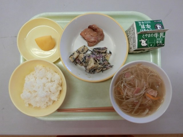 秋が旬の食材を使った献立です。子どもたちは柿を楽しみにしていました。