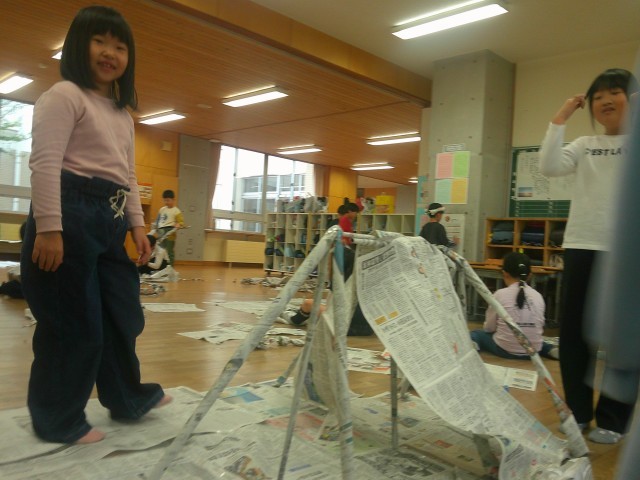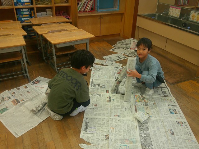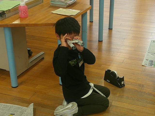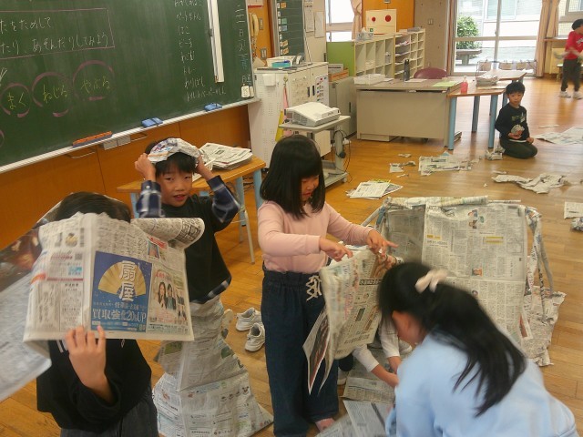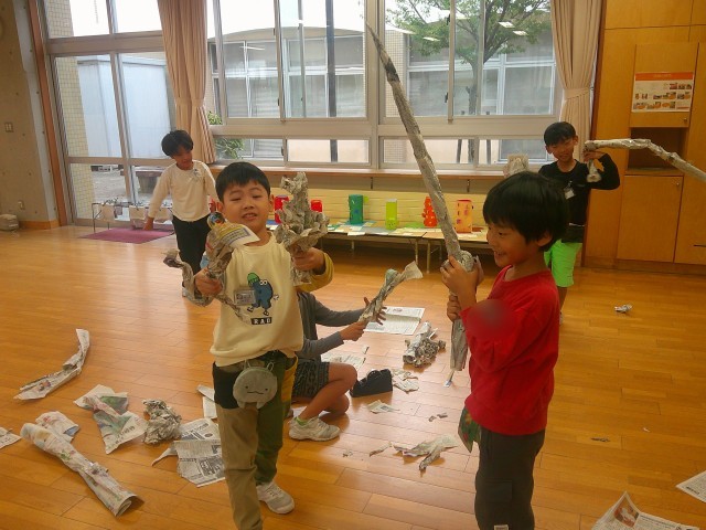 新聞紙を使って、ねじったり、丸めたり、繋げたりして遊びました。