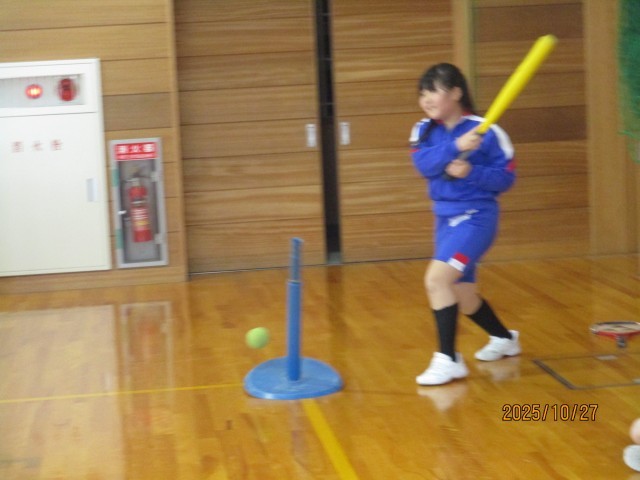 体育で「ティーボール」に取り組んでいます。台に置いたボールをバットで打って走る、簡単な野球のようなスポーツです。