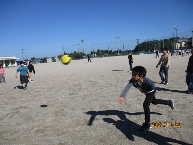 今週の体力つくりは、「ドッジボール」です。青空の下、楽しく活動しています。