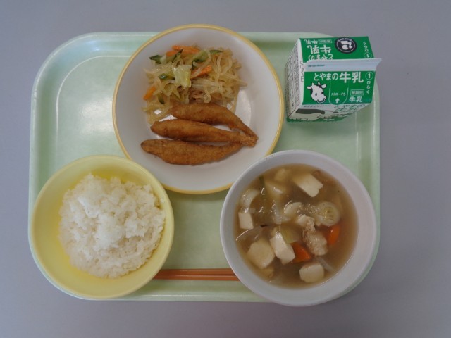 今日の献立は、ごはん、牛乳、わかさぎのフリッター、バンサンスー、サムゲタンスープです。