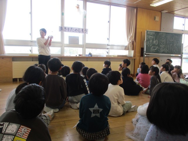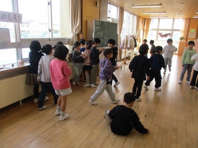 今日はあきを楽しむために、あきのものを使ってけんだまやどんぐりごまなどを作りました。