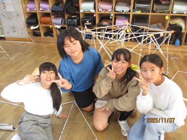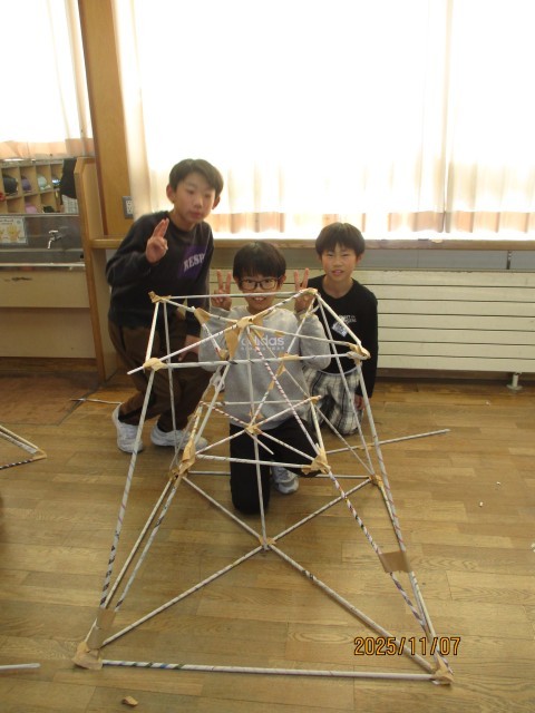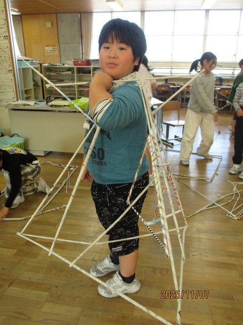 素材は紙なので、なかなかな立体的にならず、苦戦しているようでしたが、三角形につなぐことが最強なんだと気付き、友達と協力しながらどんどんつないで大きな作品を完成させていました。
