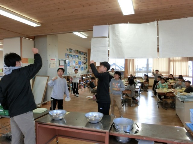 今日のおかわりじゃんけんの写真は、5年1組です。大きなあじフライにかぶりついて食べていました。
