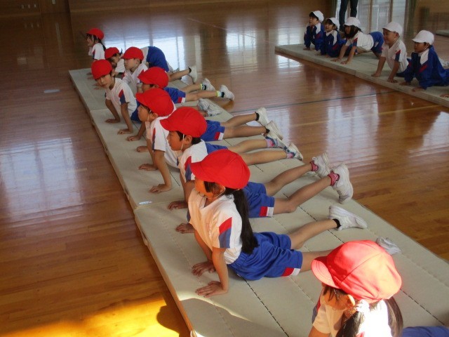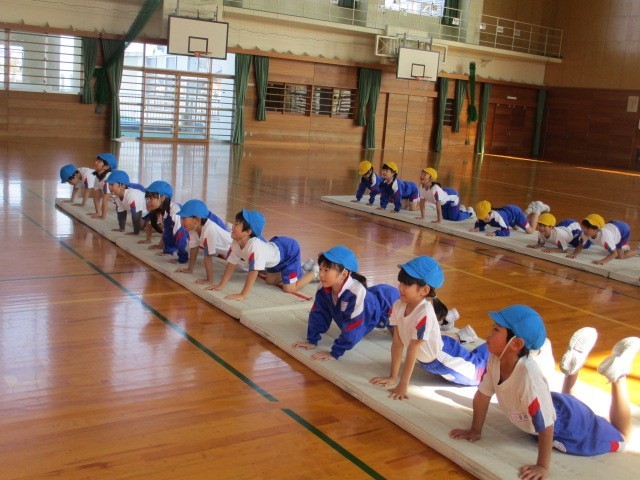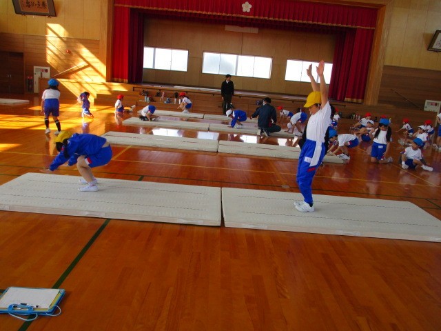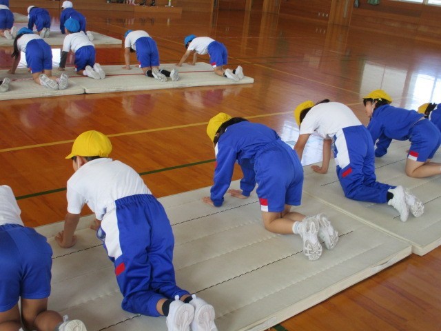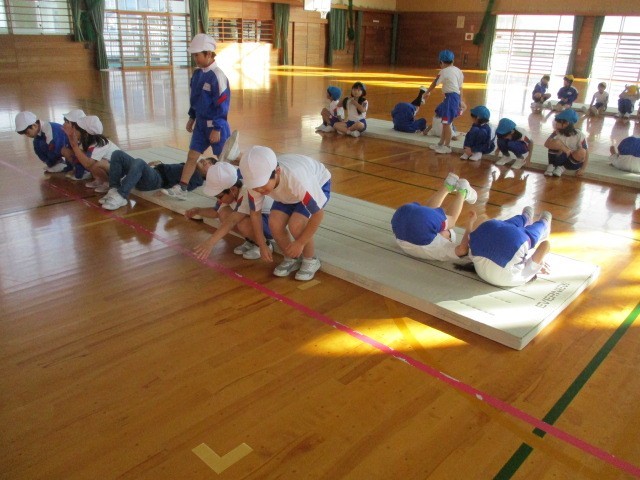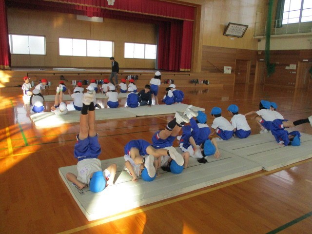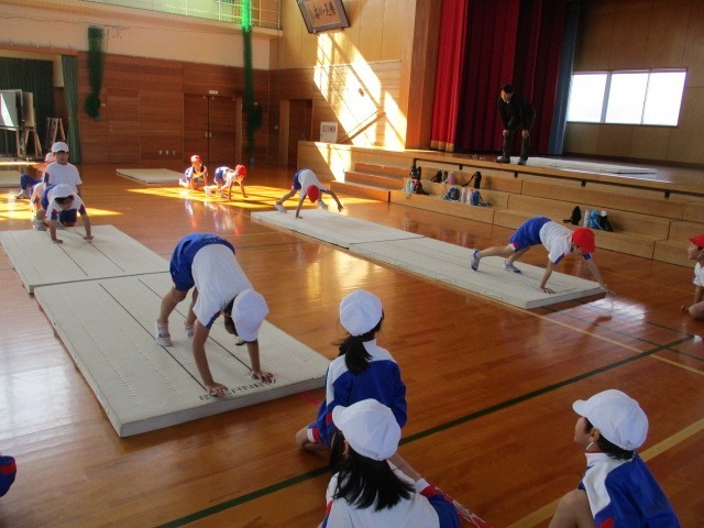 体育の時間にマット運動に取り組んでいます。「ゆりかご」や「タワー」、いろいろな動物歩きで体の動かし方を練習しています。前ころがりや後ろころがりもだんだんできるようになってきました。