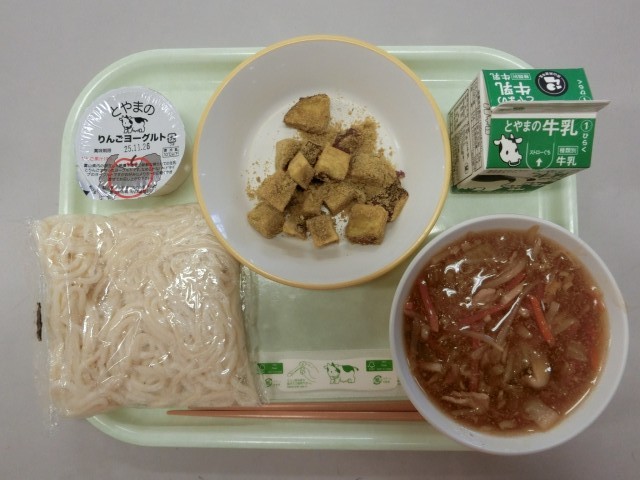 今日の献立は、ソフト麺、牛乳、ソフト麵の五目あん、さつまいものきなことくわの葉がらめ、りんごヨーグルトです。