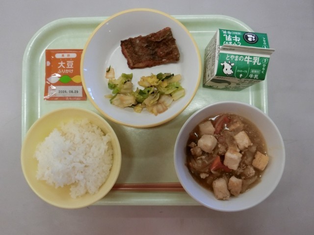 今日の献立は、ごはん、牛乳、ホキの竜田揚げ、チンゲンサイひたし、厚揚げのそぼろ煮、大豆ふりかけです。