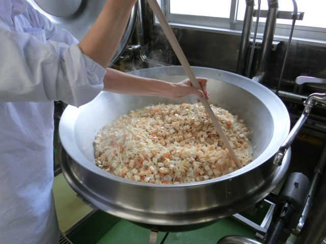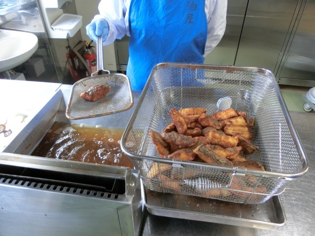 魚は1つ1つ丁寧に、調理員さんが揚げてくださっています。魚が苦手な児童も、揚げることで食べやすくなります。