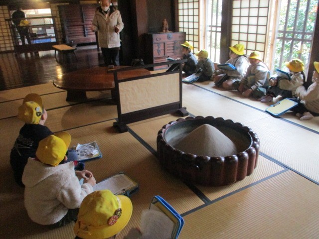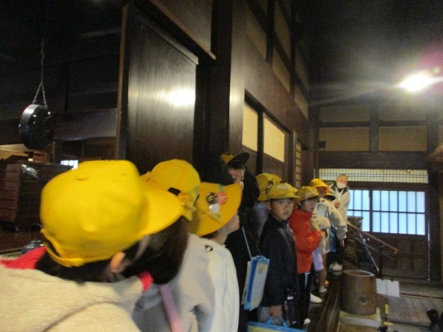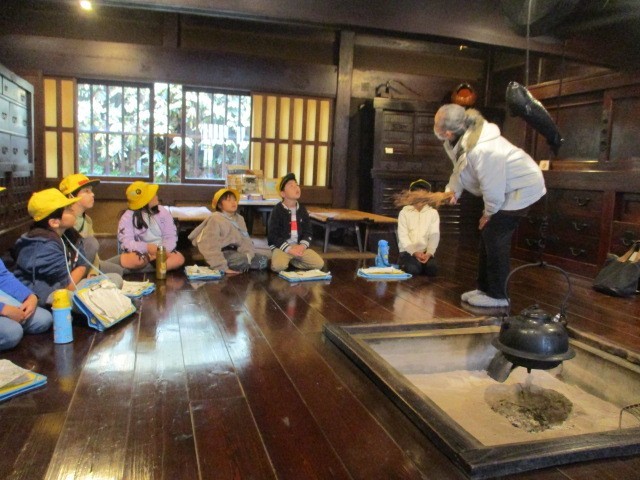 民藝合掌館での子供たちの様子です。合掌造りの特徴やいろりの役割・生活の知恵について教えていただきました。