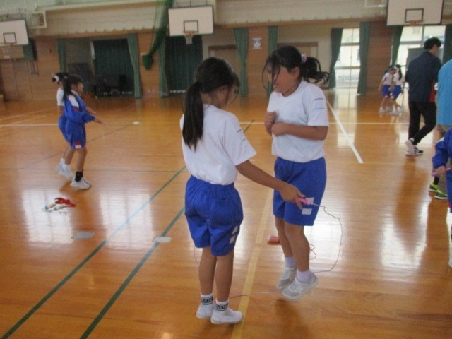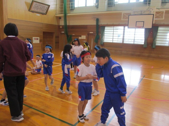 まずは、体育の学習。学年合同で身体づくりをを通して、なかまづくりをしました。