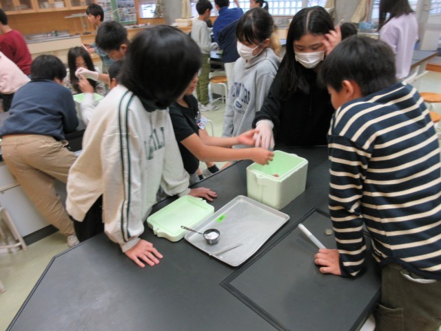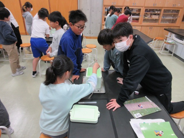 理科の学習では、水の温度によって物の溶け方に違いがあるかを実験しています。