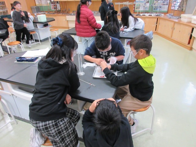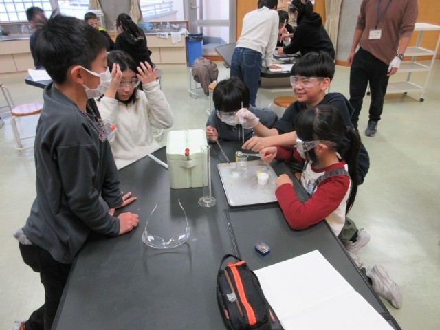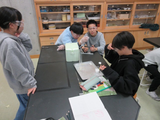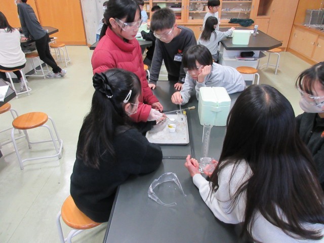 理科の実験に取り組んでいます。温度によって物の溶け方に違いがあるのか実験しています。